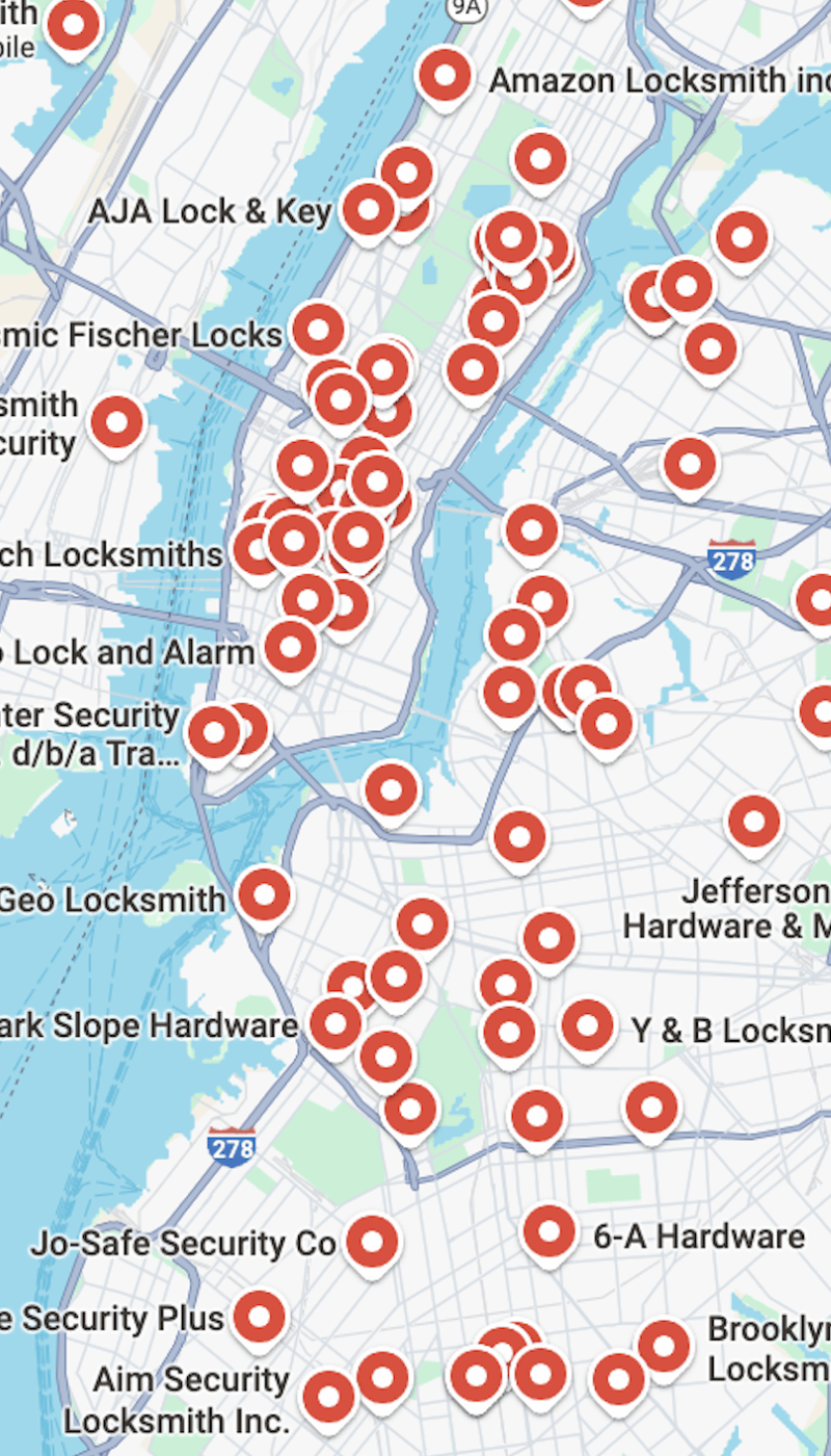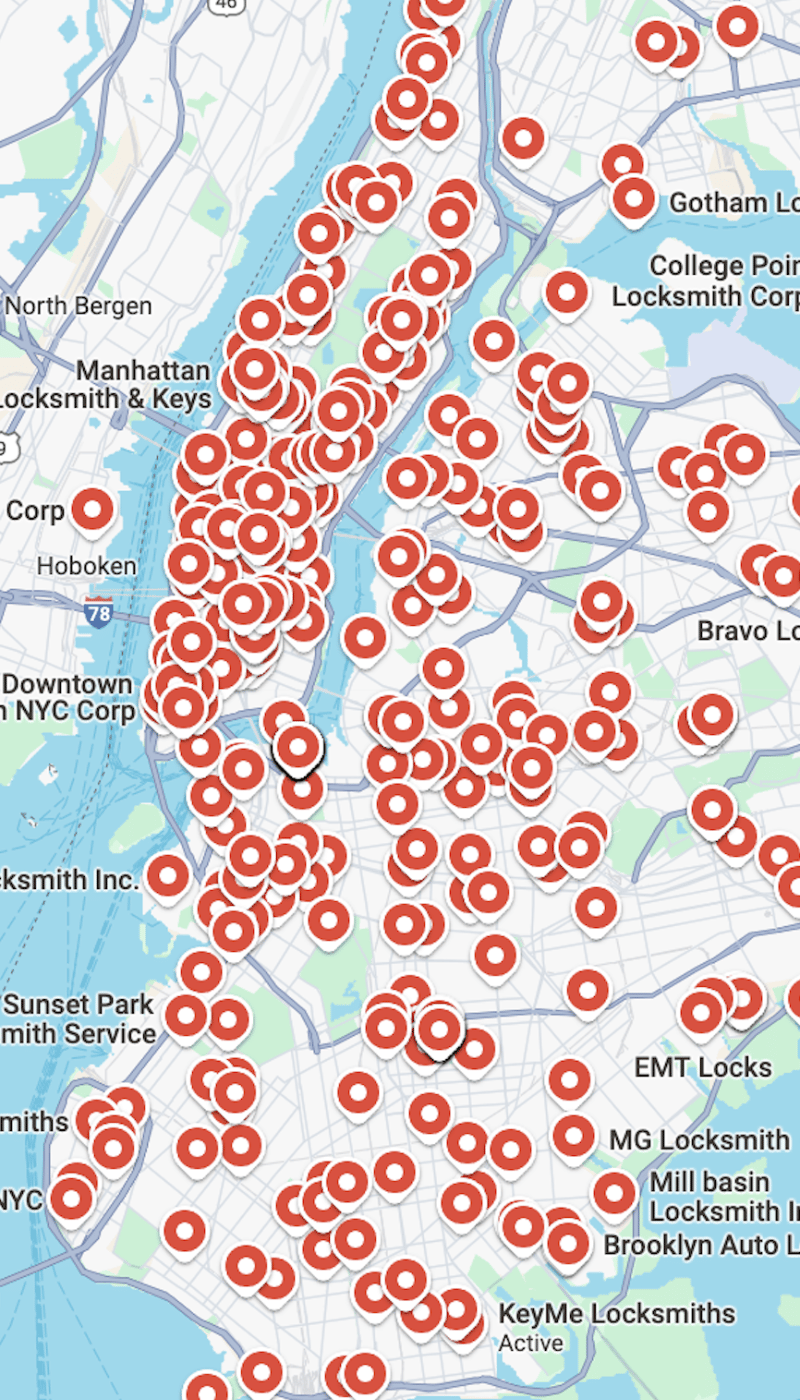 When StopLocksmithFraud began its work, New York City’s Google Maps was overwhelmed by an extreme clustering of locksmith listings. Hundreds of red pins blanketed the map, many tied to fake business names and addresses. This flood of fraudulent listings pushed legitimate locksmith shops out of search results, allowing deceptive operators to dominate.