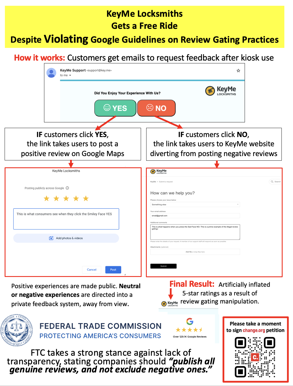 Google Maps Content Policy on Prohibited and Restricted Content states, “We do not allow merchants to…selectively solicit positive reviews from customers”. So why does a multi-million-dollar company like KeyMe Locksmiths is allowed to get away with using this deceptive practice?