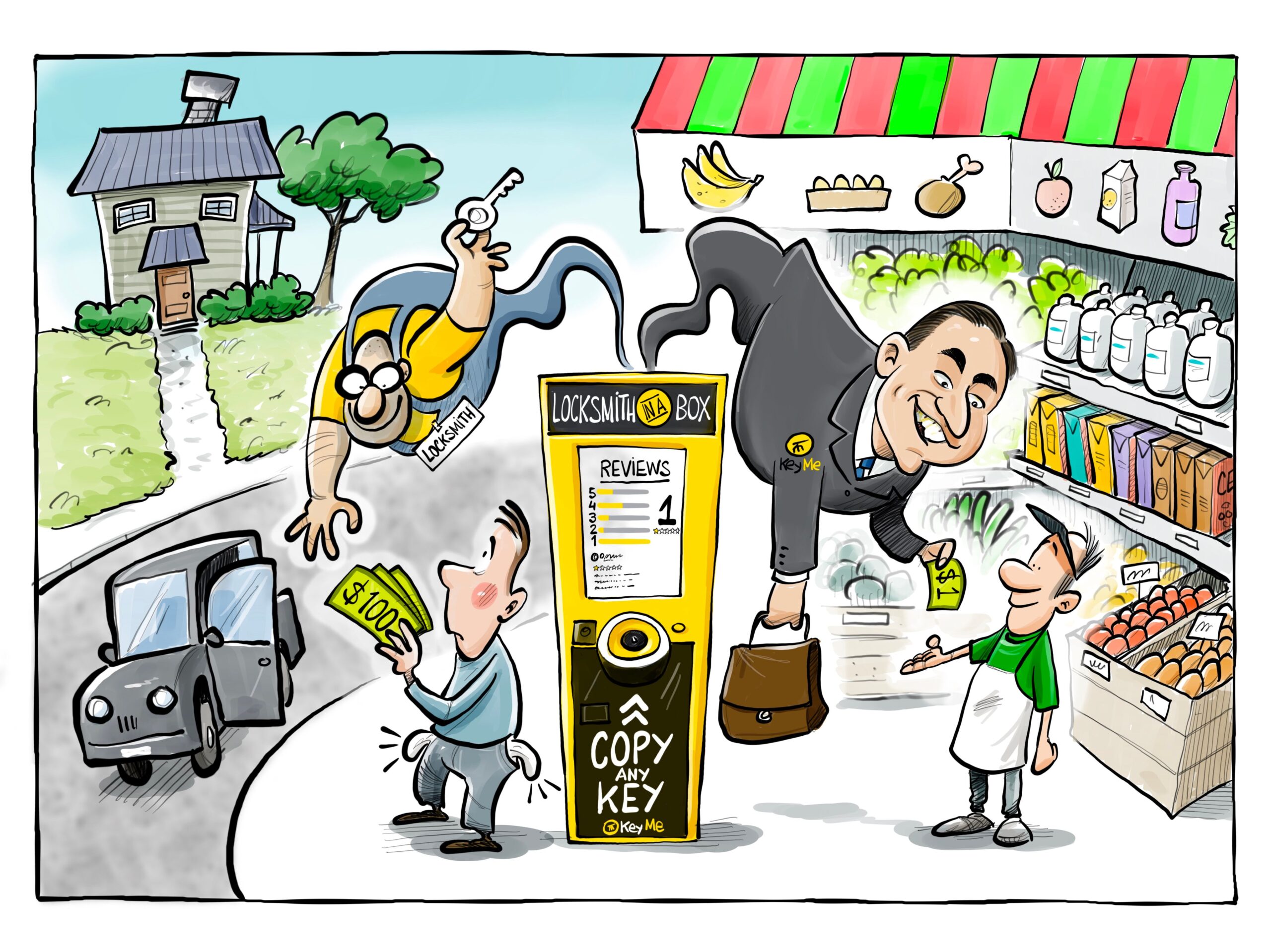 KeyMe Locksmiths is a key duplicating kiosk masquerading as a locksmith. The company positions kiosks in retailers nationwide, claiming to be a “locksmith in a box”. However, KeyMe does not hire a single locksmith nationwide! The kiosk strategy allows KeyMe to bypass the most burdensome aspect of running a business, physical retail location for the business.
